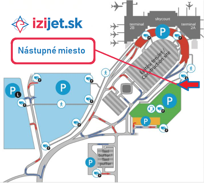 - Ako sa dostať k nástupnému miestu z terminálu 2A: Po opustení príletovej haly otočnými dverami sa vydajte rovno, nasledujte tabuľku TERMINAL PARKING (zelená), chodte dole po schodoch, kde sa nachádza nástupné miesto.